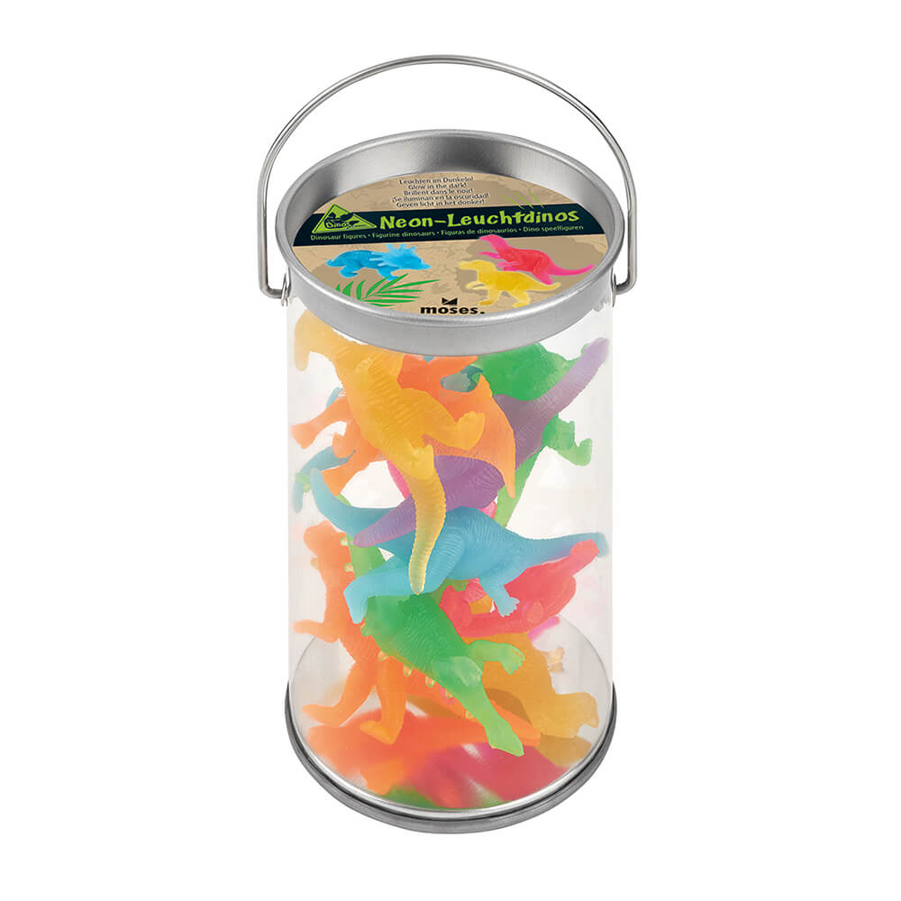 Un pequeño tesoro para los amantes de los dinosaurios. Cada bote incluye 12 figuras de dinos en miniatura que brillan en la oscuridad, ideales para jugar, decorar o coleccionar. Solo hay que exponerlas a la luz y luego disfrutar del efecto fluorescente en la oscuridad. Perfecto como detalle educativo o regalo original.