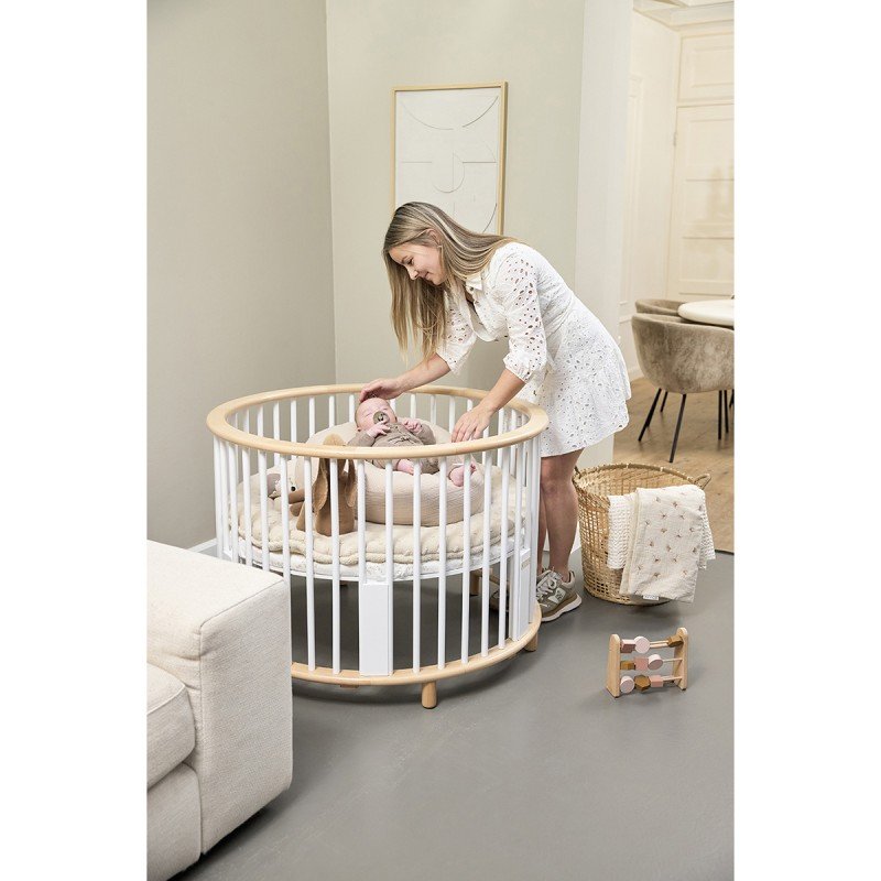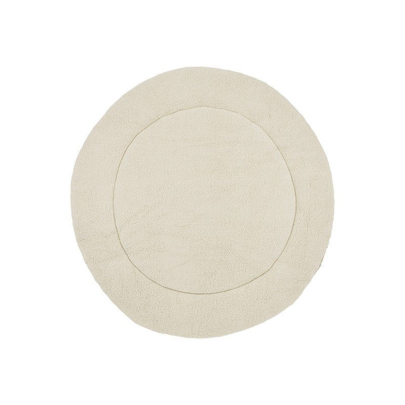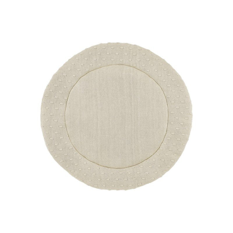 La parte superior está confeccionada en algodón 100%, mientras que la parte inferior cuenta con un tejido tipo teddy extra suave, proporcionando una sensación mullida y confortable. Es ideal para parques redondos, aunque también puede utilizarse directamente en el suelo o incluso en el jardín como alfombra de juegos.