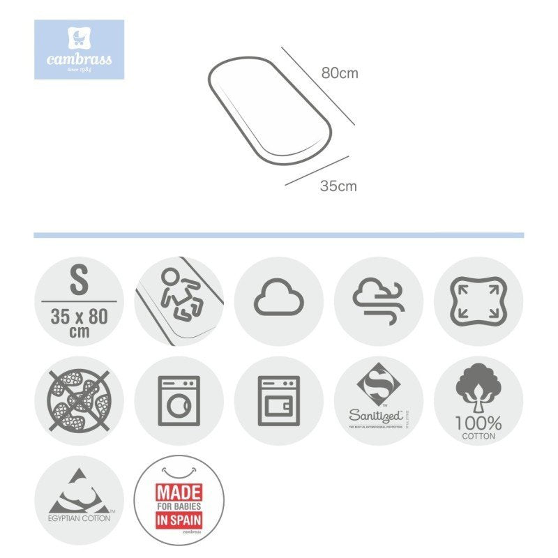 La Sábana Bajera Ajustable para Moisés o Capazo de Cambrass ofrece una sujeción perfecta gracias a su goma elástica lateral, adaptándose al colchón para garantizar comodidad y protección. Fabricada en España con algodón 100% de alta calidad, incluye tratamiento Sanitized, que proporciona una defensa antimicrobiana duradera frente a bacterias, hongos y malos olores. Una opción segura, suave y resistente para el descanso del bebé.