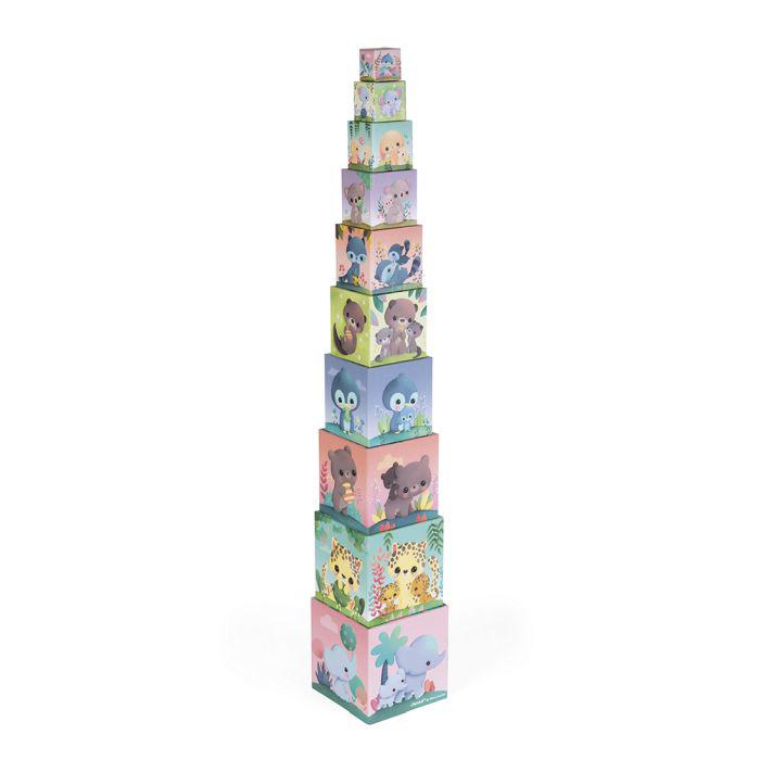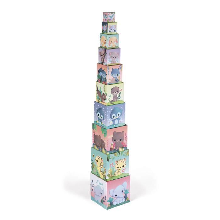 • Set de 10 cubos de cartón apilables con ilustraciones de animales.