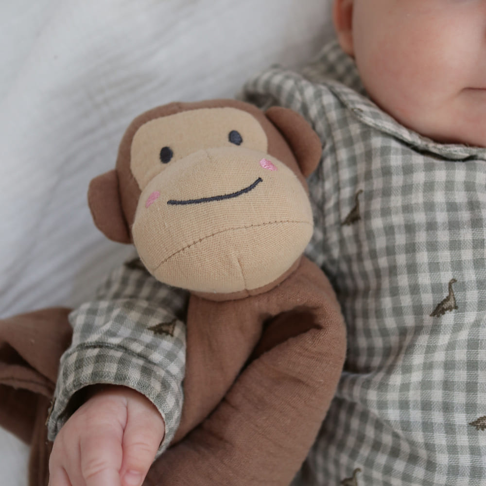 La Mantita Doudou Mono de Jabadabado forma parte de una encantadora colección protagonizada por un simpático monito y su plátano favorito. Suave, ligera y muy agradable al tacto, es perfecta para acompañar al bebé en sus primeros meses, aportando seguridad y confort. Ideal para cuna, cochecito o para llevar siempre a mano, se convierte fácilmente en el compañero favorito del pequeño.