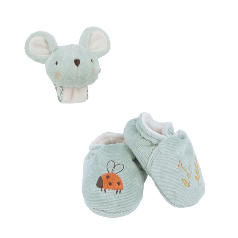 Un tierno estuche de nacimiento pensado para estimular al bebé a través del sonido y el movimiento. Incluye una suave pulsera de microterciopelo con la cabeza de un ratón de peluche y un cascabel interior, junto a unos patucos de pana decorados con delicados bordados inspirados en la canción “El ratón verde”. Uno de los patucos también contiene un pequeño cascabel oculto. Al mover manos y pies, el bebé provoca el sonido, descubriendo el vínculo entre acción y resultado, mientras desarrolla su motricidad y curiosidad.