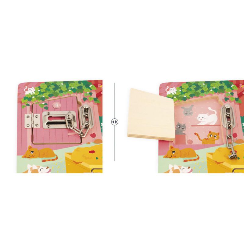 ¡Toc, toc, toc! ¿Quién se esconde detrás de las puertas del granero? Este encantador tablero de madera invita a los niños a descubrir la vida de los animales de la granja mientras aprenden jugando. Incluye 5 puertas con distintos sistemas de apertura: una llave con cerradura, un pestillo, una cadena de seguridad, un cierre de palanca y un cerrojo de botón. Cada puerta tiene un color y un número que corresponde al número de crías escondidas detrás. Un juguete perfecto para estimular la destreza, la coordinación y el aprendizaje de colores, números y animales de una forma divertida.