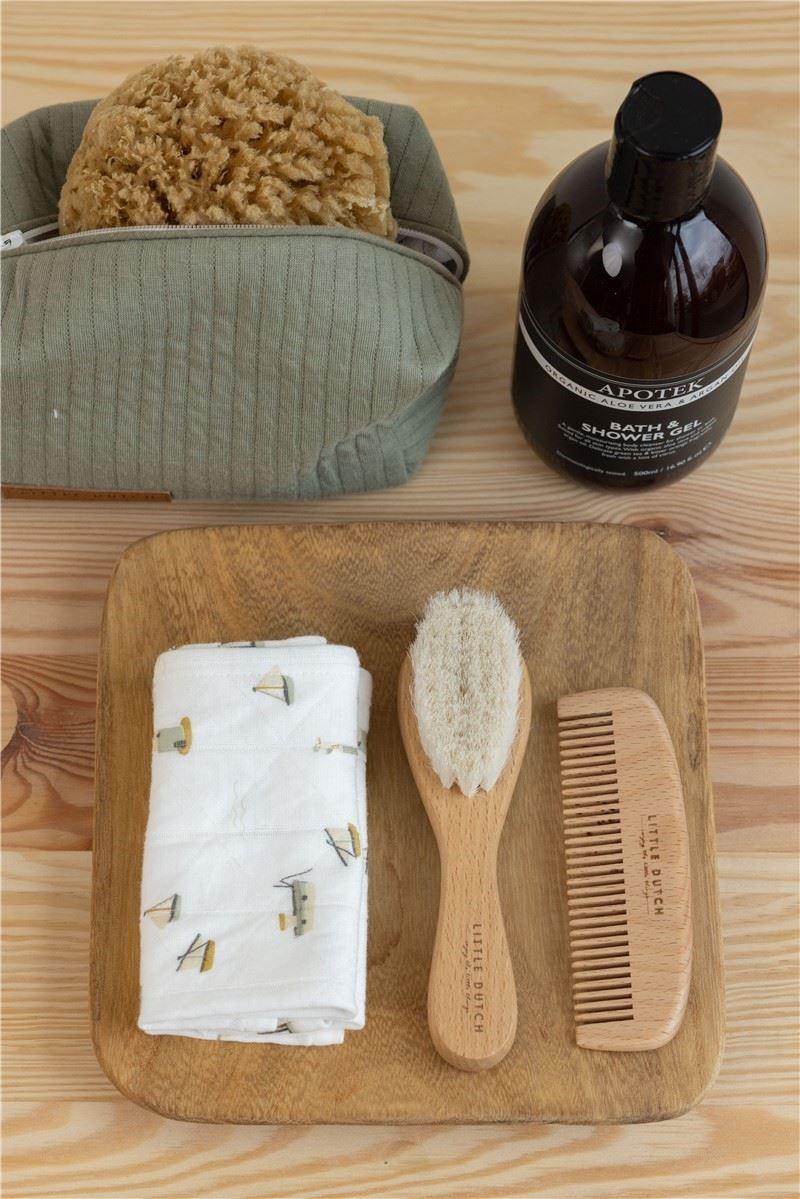 Fabricado en materiales naturales, con mango de madera y cerdas de lana, combina funcionalidad y estilo en un diseño atemporal propio de Little Dutch.