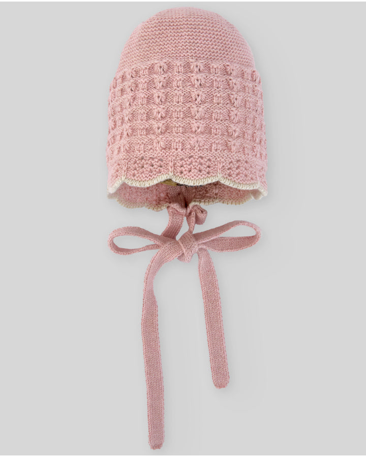 Capota de algodón y cashmere con estructura calada y textura delicada. Presenta volante de batista en el contorno, lazo decorativo y chapa de nácar como detalle. Ideal para acompañar los looks de la colección PASCUA.