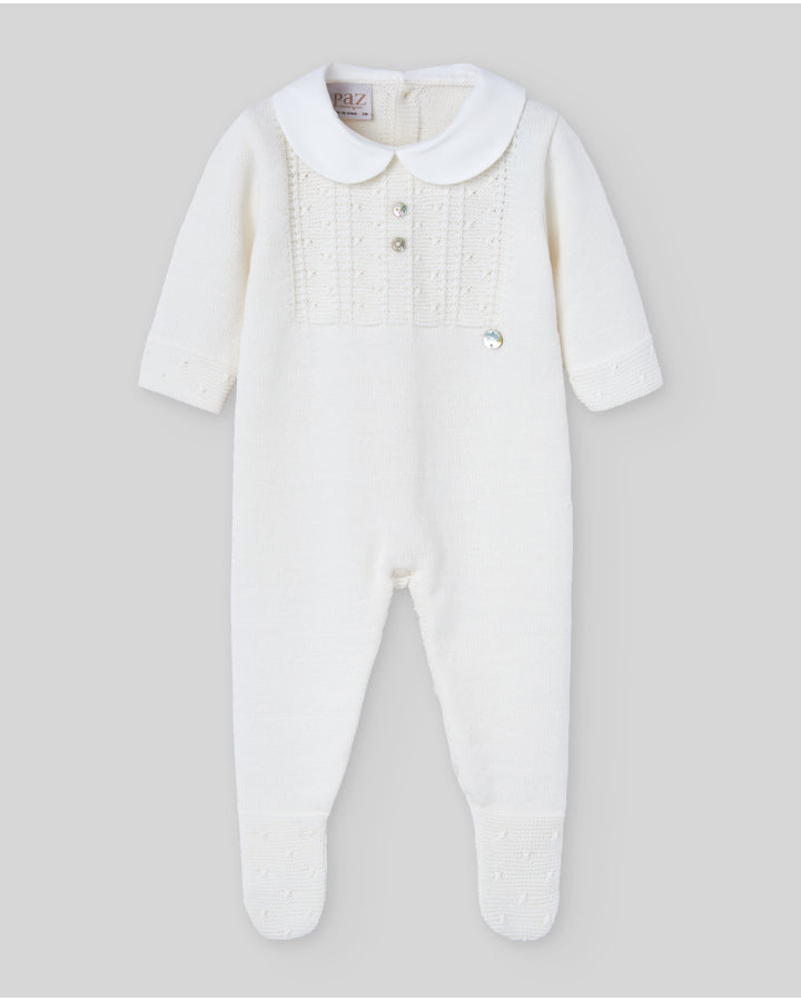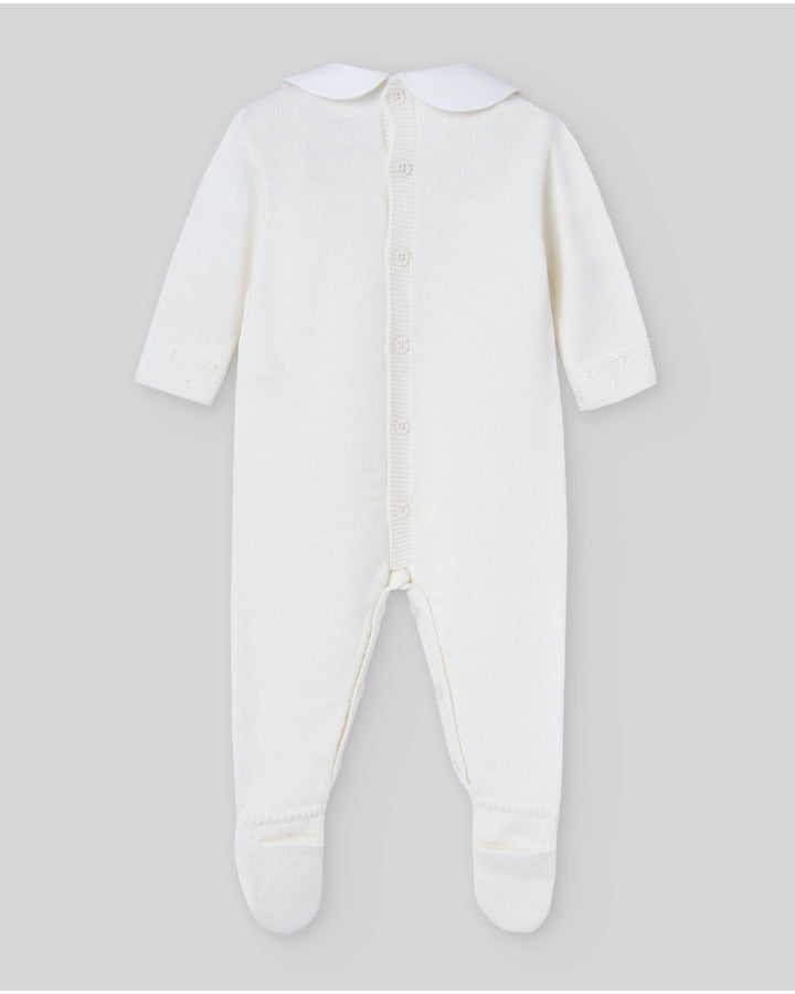 Pelele para niño con pies y cuello, confeccionado en punto suave, con diseño estampado y detalles bordados. Cierre trasero y entrepierna con botones a presión. Perfecto para mantener al bebé cómodo y elegante.