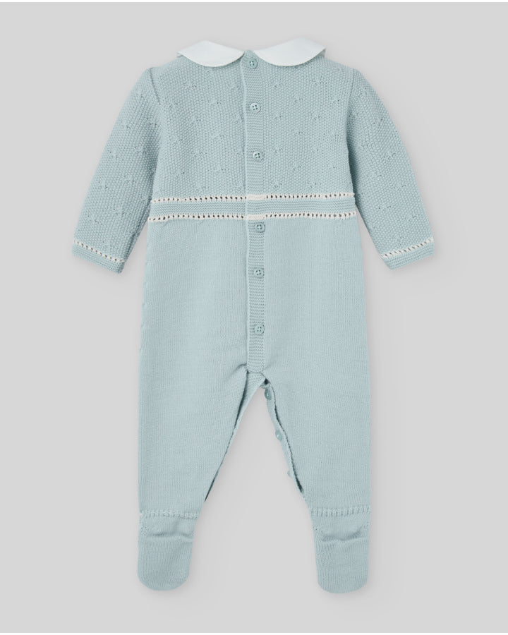 Pelele para niño con pies, cuello clásico y detalles en el delantero. Cierre trasero completo con botones a presión. Fabricado en tejido suave y agradable al tacto para máxima comodidad.