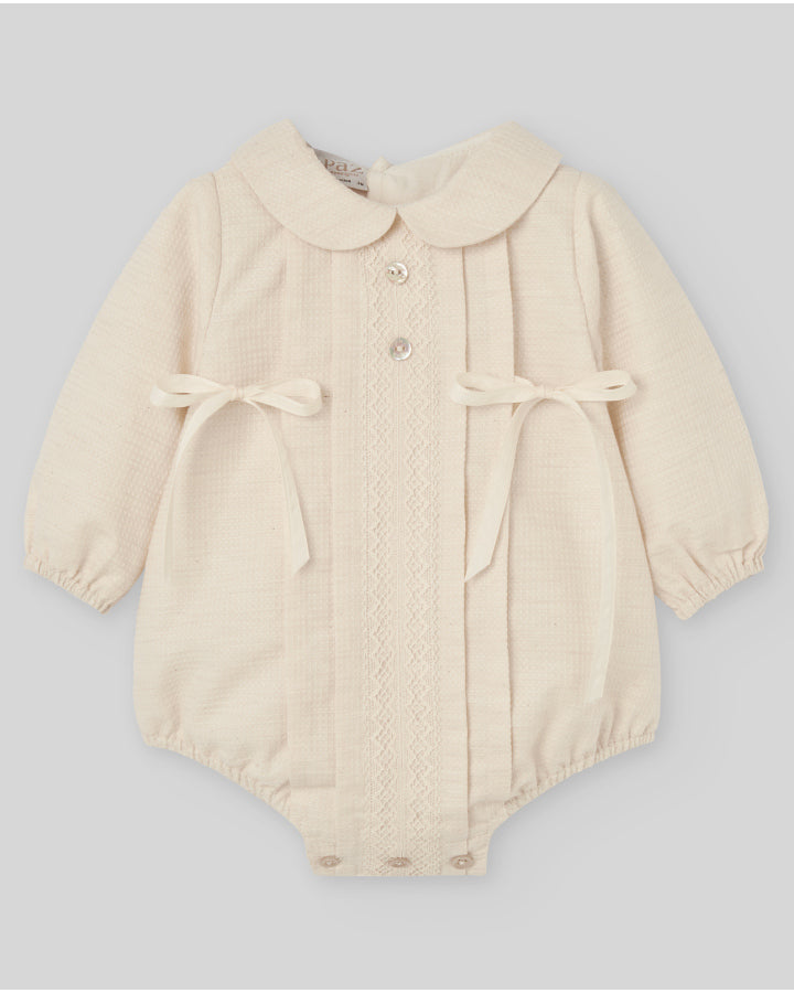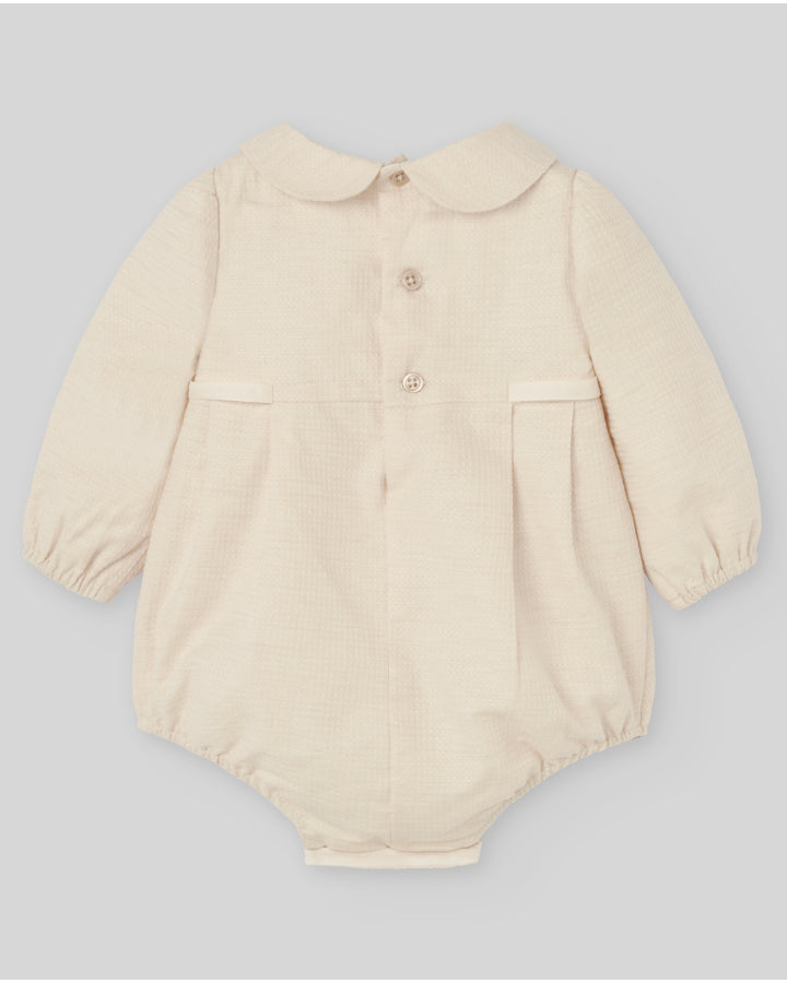 Pelele en tela jaquard con diseño elegante, ideal para bautizo. Cuello redondo y detalles bordados. Cierre trasero y entrepierna con botones.