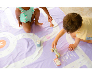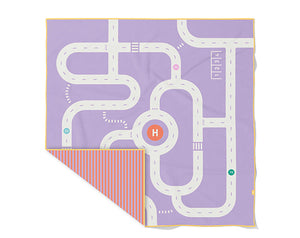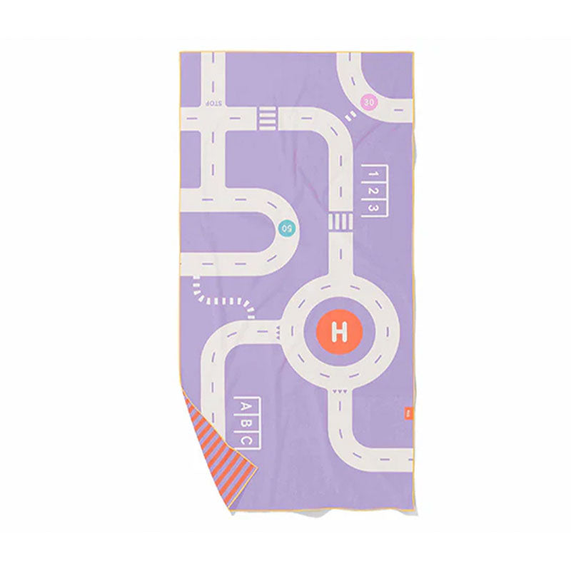 Una toalla que invita a imaginar y explorar. El modelo On the road transforma la clásica toalla en un circuito de carreteras lleno de posibilidades: ideal para jugar con coches de juguete o inventar rutas mientras disfrutan del sol. En el reverso, un bonito patrón gráfico la convierte también en una toalla funcional y estilosa.